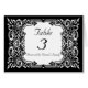 Tarjeta preciosa del número de la tabla de la recepción nupcial hecha en blanco y negro. Un marco barroco adornado del estilo, en blanco y negro, rodea el área de texto blanca. El texto es completamente adaptable de estilo de fuente, colores, y tamaños.