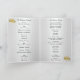 Marco de patrón de hojas de oro y rosas rojas bonitas. Cuando usted y su futuro cónyuge comiencen su marcha por el pasillo, asegúrese de que sus amigos y familiares estén preparados para celebrar cada paso de su viaje con estos elegantes programas de boda doblados. Esta hermosa tarjeta de programa está lista para ser personalizada. Personalice la tarjeta cambiando el texto en los campos proporcionados en todas las páginas. Puede cambiar el estilo de fuente, tamaño y color, así como el tipo y estilo de papel.
