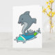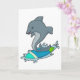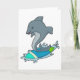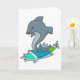 Tarjeta Delfín como surfista con tabla de surf