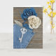 Rosas de Denim en bolsillo de jean azul con llave antigua en madera rústica de granero.