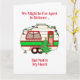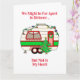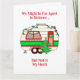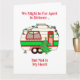 Te deseamos una Feliz Navidad desde la carretera. Una tarjeta de cumpleaños adorable para alguien que viaja en Navidad. Una divertida autocaravana decorada en rojo y verde con luces de Navidad. Dibujo animado a mano. Te deseamos una Feliz Navidad y un Año Nuevo Aventurero.