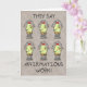 Una tarjeta de cumpleaños humorística con seis pollos jóvenes personalizados parados en primavera con las palabras "pollo de primavera" sobre cada uno de ellos y el texto "¡Dicen afirmaciones que funcionan! Este divertido diseño de deseos de cumpleaños pretende burlarse un poco de la idea de que simplemente repetir una frase una y otra vez puede hacerla realidad. En el interior de la tarjeta se puede leer "Así que . ... ¿Te sientes más joven? ¡Feliz cumpleaños!"