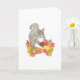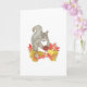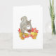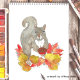 Desea un Feliz Día de Acción de Gracias a amigos y familiares o simplemente envía una tarjeta de Otoño con este adorable original acuarela con una dulce ardilla gris sosteniendo una pequeña tarta de pacana (su favorita!) y sentada en un montón de hojas de colores de otoño.