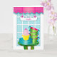 Tarjeta Día de la Madre, hija, ventana y torta y copas