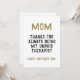 Tarjeta del Día de la Madre con humorística cita 'Gracias por ser siempre mi terapeuta no pagada'. El texto está en tipografía moderna y negrita. Puedes cambiar cualquier texto en la tarjeta.