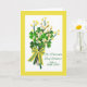 ¡Deseos del Día de San Patricio! Para una tía querida, tarjeta de saludo de papel. Enmarcado en amarillo intenso con un ramo de manantiales de forsythia amarilla, calabazas y tréboles en diversos tonos verdes. Fotografía de un arco de primavera con rayas amarillas y puntos de polka blancos. Arte, imagen y verso copyright © Shoaff Ballanger Studios, 2021.
