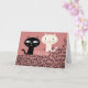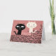 GATOS NEGROS Y BLANCOS MIRÁNDOSE, LA TARJETA TIENE FONDO ROSA Y LEE AMOR POR TODAS PARTES, Y TAMBIÉN MEOW UN PAR DE VECES. DENTRO DICE "AMOR A PRIMERA MEOW"