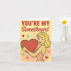 Celebra el amor clásico con esta encantadora tarjeta del Día de San Valentín 'Eres mi corazón'! Con una sonriente mujer de estilo retro con un vestido rosa sosteniendo un corazón rojo intenso, rodeada de explosiones de estrellas juguetonas en un suave fondo amarillo, este diseño irradia calidez, nostalgia y afecto. Perfecto para enamorados, cónyuges o cualquier persona que aprecie el romance vintage, esta tarjeta transmite amor atemporal con un guiño y una sonrisa.