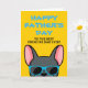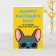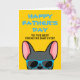 Frenchies, ¿qué mejor manera de mostrarle a tu Papá cuánto lo amas este Día del Padre con una tarjeta personalizada justo de ti! El diseño presenta una ilustración estilo caricatura de un bulldog francés de color azul que lleva gafas de sol azules con la leyenda "¡Feliz Día del Padre al mejor Papá Frenchie de todos!" escrita en la parte frontal. El interior de la tarjeta dice "Para Papá, te amo más que golosinas" pero se puede cambiar a la redacción de tu elección.