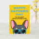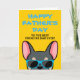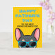 Frenchies, ¿qué mejor manera de mostrarle a tu Papá cuánto lo amas este Día del Padre con una tarjeta personalizada solo de ti! El diseño presenta una ilustración estilo caricatura de un bulldog francés de color marrón azulado que lleva gafas de sol azules con la leyenda "¡Feliz Día del Padre al mejor Papá Frenchie de todos!" escrita en la parte frontal. El interior de la tarjeta dice "Para Papá, te amo más que golosinas" pero se puede cambiar a la redacción de tu elección.