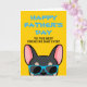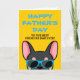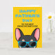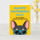 Frenchies, ¿qué mejor manera de mostrarle a tu Papá cuánto lo amas este Día del Padre con una tarjeta personalizada hecha solo por ti! El diseño presenta una ilustración estilo caricatura de un bulldog francés de color negro con anteojos de sol azules con la leyenda "¡Feliz Día del Padre al mejor Papá Frenchie de todos!" escrita en la parte frontal. El interior de la tarjeta dice "Para Papá, te amo más que a las golosinas", pero se puede cambiar a la redacción de tu elección.