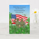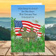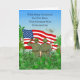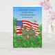 Esta tarjeta de salutación patriótica rinde homenaje a los hombres y mujeres que sirvieron durante la Guerra de Vietnam. La obra de arte muestra a dos soldados del Ejército de EE. UU. parados juntos, mirando hacia la bandera estadounidense mientras un helicóptero de la época de Vietnam cruza un cielo azul claro, rodeado de palmeras y pastos altos.