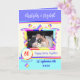 Tarjeta de saludo para el aniversario de un Boda de diamantes. Añade nombres, una foto y la fecha establecida 60 años felices juntos. Color morado y degradado de amarillo, rosa, azul y turquesa, con corazones amorosos y formas giratorias.
