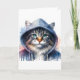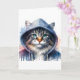 Arte de salpicaduras en acuarela que presenta un adorable gato atigrado vestido con una sudadera azul en esta tarjeta de felicitación en blanco.