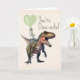 Tema de valentín "Dino-mite" con ilustración de un dinosaurio con globo verde en forma de corazón. Personaliza el texto interior.