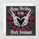 Celebra tu amor con esta tarjeta gótica de cumpleaños que contiene dos manos esqueléticas formando un corazón, rodeado de rosas rojas profundas y espinas negras. Perfecto para tu alma oscura, este elegante diseño está emparejado con la sincera frase "Feliz cumpleaños a mi alma negra", en un fluido guion gótico.