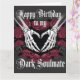 Celebra tu amor con esta tarjeta gótica de cumpleaños que contiene dos manos esqueléticas formando un corazón, rodeado de rosas rojas profundas y espinas negras. Perfecto para tu alma oscura, este elegante diseño está emparejado con la sincera frase "Feliz cumpleaños a mi alma negra", en un fluido guion gótico.