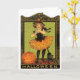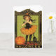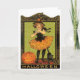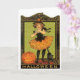 Obra de arte de una niñita con su disfraz de bonito Halloween, su gato negro y una sonriente jota-o-lantern. Dorado, naranja y colores negros