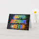 Estas características de la diversión, vibrantes, multicoloras del cumpleaños de felicitación de la tarjeta del diseño el mensaje "FELIZ CUMPLEAÑOS," y el nombre común "BETH" con las letras que tienen un espectro colorido del arco iris tienen gusto del modelo del colorante de la pendiente. El fondo del frente también ofrece un modelo colorido inspirado por el aspecto de estallar los fuegos artificiales celebradores. Las características interiores un mensaje de encargo del saludo, o se podrían quizás despejar y salieron del espacio en blanco si se va un mensaje a ser escrito a mano en lugar de otro. Una tarjeta de felicitación como esto podía ser una manera de la diversión de reconocer el cumpleaños alguien Beth nombrado. [~Z0000350]