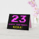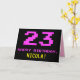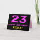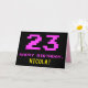 La parte delantera de este divertido, geeky y nerd diseño de tarjetas de felicitación con temática de cumpleaños incluye un gran número rosa "23", junto con el mensaje "FELIZ CUMPLEAÑOS", de color rosa, y un audaz nombre de destinatario personalizado amarillo. El texto tiene un aspecto inspirado en el de videojuegos retro de 8 bits y gráficos de juegos de computadora de los años 70 y 80, y el fondo es negro de color. El interior presenta un mensaje de bienvenida de cumpleaños de personalizado, o tal vez podría ser borrado y dejado en blanco si se va a escribir un mensaje a mano. Una tarjeta de cumpleaños de personalizable como esta podría ser una manera divertida de reconocer el 23 cumpleaños de alguien. [~Z0000478]