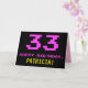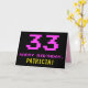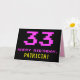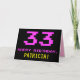 La parte delantera de este divertido, nerd y geeky diseño de tarjetas de felicitación con temática de cumpleaños incluye un gran número "33" y el mensaje "FELIZ CUMPLEAÑOS", color rosa, junto con un audaz nombre de destinatario editable amarillo. El texto tiene un aspecto inspirado en el de los clásicos videojuegos de 8 bits y gráficos de videojuegos de los años 70 y 80, y el fondo es de color negro. El interior tiene un mensaje personalizado de bienvenida de cumpleaños, o tal vez podría ser borrado y dejado en blanco si un mensaje se escribe a mano en su lugar. Una tonta tarjeta personalizada de cumpleaños como esta podría ser una manera divertida de enviar un mensaje en celebración de los treinta y tres años de alguien. [~Z0000478]