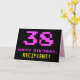 La parte delantera de este divertido, geek y nerd diseño de tarjetas de felicitación con temática de cumpleaños incluye un gran número "38" y el mensaje "FELIZ CUMPLEAÑOS", color rosa, junto con un audaz nombre de destinatario editable amarillo. El texto presenta un aspecto inspirado en el de los gráficos retro de videojuegos/videojuegos de 8 bits de los años 70 y 80, y el fondo es negro de color. El interior presenta un mensaje de bienvenida de cumpleaños personalizado, o tal vez podría ser borrado y dejado en blanco si se va a escribir un mensaje a mano. Una tarjeta de cumpleaños personalizada tonta como esta podría ser una manera divertida de reconocer el cumpleaños treinta y ocho de alguien. [~Z0000478]