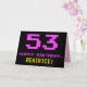 La parte delantera de este divertido, nerd y geeky diseño de tarjetas de felicitación de cumpleaños incluye un gran número rosa "53", junto con el mensaje "FELIZ CUMPLEAÑOS", en rosa, y un audaz nombre de destinatario personalizado amarillo. El texto presenta una apariencia inspirada en la de los gráficos de videojuegos/juegos de computadora de 8 bits de los años 70 y 80, y el fondo es negro de color. El interior presenta un mensaje de bienvenida de cumpleaños de personalizado, o tal vez podría ser borrado y dejado en blanco si se va a escribir un mensaje a mano. Una tarjeta de cumpleaños tonta como esta podría ser una manera divertida de enviar deseos de cumpleaños a una mujer o a alguien más que esté celebrando su cincuenta tercer cumpleaños. [~Z0000478]