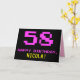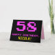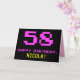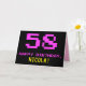 La parte delantera de este divertido, nerd y geeky diseño de tarjetas de felicitación con temática de cumpleaños incluye un gran número rosa "58", junto con el mensaje "FELIZ CUMPLEAÑOS", de color rosa, y un audaz nombre de destinatario personalizado amarillo. El texto presenta un aspecto inspirado en el de los clásicos gráficos de videojuegos/videojuegos de 8 bits de los años 70 y 80, y el fondo es negro de color. El interior presenta un mensaje de bienvenida de cumpleaños de personalizado, o tal vez podría ser borrado y dejado en blanco si se va a escribir un mensaje a mano. Una tarjeta de cumpleaños personalizada tonta como esta podría ser una manera divertida de enviar un mensaje celebrando el cincuenta y ocho cumpleaños de alguien. [~Z0000478]