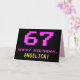 La parte delantera de este divertido, geeky y nerd diseño de tarjetas de felicitación con temática de cumpleaños incluye un gran número "67" y el mensaje "FELIZ CUMPLEAÑOS", de color rosa, junto con un audaz nombre de destinatario editable amarillo. El texto tiene un aspecto inspirado en el de los gráficos vintage de videojuegos/videojuegos de 8 bits de las décadas de 1970 y 1980, y el fondo es negro de color. El interior presenta un mensaje de bienvenida de cumpleaños editable, o tal vez podría ser borrado y dejado en blanco si se va a escribir un mensaje a mano. Una tonta tarjeta de cumpleaños de personalizable como esta podría ser una manera divertida de celebrar el 67 cumpleaños de alguien. [~Z0000478]