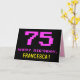 La parte delantera de este divertido, geek y nerd diseño de tarjetas de felicitación de cumpleaños incluye un gran número "75" y el mensaje "FELIZ CUMPLEAÑOS", de color rosa, junto con un audaz nombre de destinatario editable amarillo. El texto tiene un aspecto inspirado en el de los clásicos gráficos de videojuegos/juegos de computadora de 8 bits de los años 70 y 80, y el fondo es negro de color. El interior presenta un mensaje de bienvenida de cumpleaños editable, o tal vez podría ser borrado y dejado en blanco si se va a escribir un mensaje a mano. Una tarjeta de cumpleaños personalizada tonta como esta podría ser una manera divertida de enviar un mensaje celebrando el cumpleaños setenta y cinco de alguien. [~Z0000478]