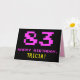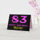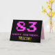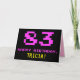 La parte delantera de este divertido, nerd y geeky diseño de tarjetas de felicitación de cumpleaños incluye un gran número "83" y el mensaje "FELIZ CUMPLEAÑOS", de color rosa, junto con un audaz nombre de destinatario de personalizable amarillo. El texto tiene un aspecto inspirado en el de los videojuegos de 8 bits de estilo vintage y los gráficos de juegos de computadora de los años 70 y 80, y el fondo es negro de color. El interior presenta un mensaje de bienvenida de cumpleaños personalizado, o tal vez podría ser borrado y dejado en blanco si se va a escribir un mensaje a mano. Una tarjeta de cumpleaños personalizada tonta como esta podría ser una manera divertida de reconocer el ochenta y tres cumpleaños de alguien. [~Z0000478]