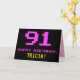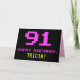 La parte delantera de este divertido, nerd y geeky diseño de tarjetas de felicitación con temática de cumpleaños incluye un gran número "91" y el mensaje "FELIZ CUMPLEAÑOS", color rosa, junto con un audaz nombre de destinatario personalizado amarillo. El texto presenta una apariencia inspirada en la de los gráficos retro de videojuegos/juegos de computadora de 8 bits de los años 70 y 80, y el fondo es negro de color. El interior presenta un mensaje de bienvenida de cumpleaños editable, o tal vez podría ser borrado y dejado en blanco si se va a escribir un mensaje a mano. Una tarjeta de cumpleaños personalizada tonta como esta podría ser una manera divertida de enviar un mensaje celebrando el cumpleaños noventa de alguien. [~Z0000478]