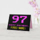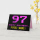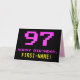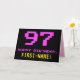 La parte delantera de este divertido, nerd y geeky diseño de tarjetas de felicitación con temática de cumpleaños incluye un gran número rosa "97", junto con el mensaje "FELIZ CUMPLEAÑOS", en rosa, y un audaz nombre de destinatario editable amarillo. El texto presenta una apariencia inspirada en la de los clásicos juegos de ordenador de 8 bits y gráficos de videojuegos de los años 70 y 80, y el fondo es negro de color. El interior tiene un mensaje de saludo de cumpleaños modificable, o tal vez podría ser borrado y dejado en blanco si se va a escribir un mensaje a mano. Una tarjeta de cumpleaños personalizada tonta como esta podría ser una manera divertida de reconocer el cumpleaños noventa y siete de alguien. [~Z0000478]