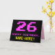 La parte delantera de este divertido, geek y nerd diseño de tarjetas de felicitación con temática de cumpleaños incluye un gran número "26" y el mensaje "FELIZ CUMPLEAÑOS", color rosa, junto con un audaz nombre de destinatario personalizado amarillo. El texto tiene un aspecto inspirado en el de los clásicos gráficos de videojuegos/computadoras de 8 bits de los años 70 y 80, y el fondo es negro de color. El interior tiene un mensaje personalizado de bienvenida de cumpleaños, o tal vez podría ser borrado y dejado en blanco si un mensaje se escribe a mano en su lugar. Una tonta tarjeta personalizada de cumpleaños como esta podría ser una manera divertida de enviar un mensaje celebrando el 26º cumpleaños de alguien. [~Z0000478]