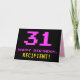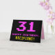 La parte delantera de este divertido, nerd y geeky diseño de tarjetas de felicitación de cumpleaños presenta un gran número rosa "31", junto con el mensaje "FELIZ CUMPLEAÑOS", en rosa, y un audaz nombre de destinatario personalizado amarillo. El texto tiene un aspecto inspirado en el de los videojuegos de 8 bits antiguos y gráficos de videojuegos de los años 70 y 80, y el fondo es negro. El interior tiene un mensaje de bienvenida de cumpleaños de personalizado, o quizás podría ser borrado y dejado en blanco si un mensaje se escribe a mano. Una tarjeta de cumpleaños personalizada tonta como esta podría ser una manera divertida de reconocer el cumpleaños número 30 de alguien. [~Z0000478]