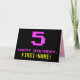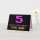 La parte delantera de este divertido, geeky y nerd diseño de tarjetas de felicitación de cumpleaños incluye un gran número "5" y el mensaje "FELIZ CUMPLEAÑOS", color rosa, junto con un audaz nombre de destinatario personalizado amarillo. El texto tiene un aspecto inspirado en el de los clásicos gráficos de videojuegos/computadoras de 8 bits de los años 70 y 80, y el fondo es negro de color. El interior presenta un mensaje de bienvenida de cumpleaños personalizado, o tal vez podría ser borrado y dejado en blanco si se va a escribir un mensaje a mano. Una tarjeta de cumpleaños personalizada tonta como esta podría ser una manera divertida de reconocer el quinto cumpleaños de alguien. [~Z0000478]