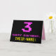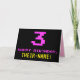 La parte delantera de este divertido, geeky y nerd diseño de tarjetas de felicitación de cumpleaños incluye un gran número rosa "3", junto con el mensaje "FELIZ CUMPLEAÑOS", en rosa, y un audaz nombre de destinatario de personalizado amarillo. El texto tiene un aspecto inspirado en el de videojuegos de 8 bits vintage y gráficos de juegos de computadora de los años 70 y 80, y el fondo es negro de color. El interior presenta un mensaje de bienvenida de cumpleaños personalizado, o tal vez podría ser borrado y dejado en blanco si se va a escribir un mensaje a mano. Una tarjeta de cumpleaños tonta como esta podría ser una manera divertida de enviar deseos de cumpleaños a un chica o a alguien más que esté celebrando su tercer cumpleaños. [~Z0000478]