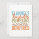Este vibrante y texturizado diseño de otoño destaca los elementos quintesentiales de la temporada de otoño con las palabras "Franelas", "Paseos en carreta de heno", "Calabazas", "Suéteres" y "Fogatas". Cada palabra se muestra en letras mayúsculas y negritas, con una textura desgastada que le da al diseño un aspecto rústico y vintage. La paleta de colores incluye azules fríos, naranjas cálidos, verdes terrosos y marrones suaves, capturando los diversos colores del otoño. Las palabras "paseos en carreta de heno" y "suéteres" están escritas en una escritura cursiva fluida que contrasta hermosamente con el texto en bloque, agregando un toque de elegancia y movimiento al diseño. Pequeños acentos de estrellas están esparcidos alrededor del texto, agregando una capa adicional de enc