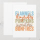 Este vibrante y texturizado diseño de otoño destaca los elementos quintesentiales de la temporada de otoño con las palabras "Franelas", "Paseos en carreta de heno", "Calabazas", "Suéteres" y "Fogatas". Cada palabra se muestra en letras mayúsculas y negritas, con una textura desgastada que le da al diseño un aspecto rústico y vintage. La paleta de colores incluye azules fríos, naranjas cálidos, verdes terrosos y marrones suaves, capturando los diversos colores del otoño. Las palabras "paseos en carreta de heno" y "suéteres" están escritas en una escritura cursiva fluida que contrasta hermosamente con el texto en bloque, agregando un toque de elegancia y movimiento al diseño. Pequeños acentos de estrellas están esparcidos alrededor del texto, agregando una capa adicional de enc
