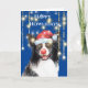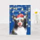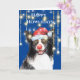 Un gracioso y lindo ilustracion acuarela de un collie de borde blanco y negro con un sombrero de Santa roja alineado con una falsa piel blanca usando pantallas de alambre y una nariz de reno rojo. Está enredado en luces de árbol de Navidad y está enmarcado por largas luces verticales de cuerda y un fondo azul. Ideal para los deseos de fin de año de negocios a los clientes o como una adorable tarjeta de vacaciones a amigos y familia.