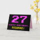 La parte delantera de este divertido, nerd y geeky diseño de tarjetas de felicitación con temática de cumpleaños incluye un gran número "27" y el mensaje "FELIZ CUMPLEAÑOS", color rosa, junto con un audaz nombre del destinatario del personalizable amarillo. El texto presenta un aspecto inspirado en el de los videojuegos de 8 bits antiguos y los gráficos de juegos de ordenador de los años 70 y 80, y el fondo es negro de color. El interior tiene un mensaje personalizado de bienvenida de cumpleaños, o tal vez podría ser borrado y dejado en blanco si se va a escribir un mensaje a mano. Una tonta tarjeta de cumpleaños de personalizable como esta podría ser una manera divertida de celebrar el 27 cumpleaños de alguien. [~Z0000478]