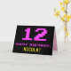 La parte delantera de este divertido, nerd y geeky diseño de tarjetas de felicitación con temática de cumpleaños incluye un gran número rosa "12", junto con el mensaje "FELIZ CUMPLEAÑOS", en rosa, y un audaz nombre de destinatario editable amarillo. El texto presenta un aspecto inspirado en los clásicos juegos de ordenador de 8 bits y gráficos de videojuegos de los años 70 y 80, y el fondo es negro. El interior tiene un mensaje de bienvenida de cumpleaños de personalizable, o quizás podría ser borrado y dejado en blanco si un mensaje se escribe a mano en su lugar. Una tonta tarjeta de cumpleaños de personalizable como esta podría ser una manera divertida de reconocer el duodécimo cumpleaños de alguien. [~Z0000478]