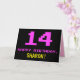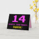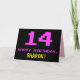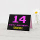 La parte delantera de este divertido, nerd y geeky diseño de tarjetas de felicitación de cumpleaños incluye un gran número rosa "14", junto con el mensaje "FELIZ CUMPLEAÑOS", en rosa, y un audaz nombre de destinatario de personalizable amarillo. El texto tiene un aspecto inspirado en el de los juegos de ordenador de estilo retro de 8 bits y los gráficos de videojuegos de los años 70 y 80, y el fondo es de color negro. El interior tiene un mensaje personalizado de bienvenida de cumpleaños, o quizás podría ser borrado y dejado en blanco si un mensaje se escribe a mano en su lugar. Una tonta tarjeta personalizada de cumpleaños como esta podría ser una manera divertida de celebrar el décimo cuarto cumpleaños de alguien. [~Z0000478]