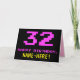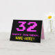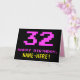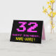 La parte delantera de este divertido, geek y nerd diseño de tarjetas de felicitación de cumpleaños incluye un gran número "32" y el mensaje "FELIZ CUMPLEAÑOS", de color rosa, junto con un audaz nombre de destinatario personalizado amarillo. El texto presenta un aspecto inspirado en el de los gráficos retro de videojuegos/videojuegos de 8 bits de los años 70 y 80, y el fondo es negro de color. El interior presenta un mensaje de bienvenida de cumpleaños de personalizado, o tal vez podría ser borrado y dejado en blanco si se va a escribir un mensaje a mano. Una tarjeta de cumpleaños personalizada tonta como esta podría ser una manera divertida de reconocer el 32 cumpleaños de alguien. [~Z0000478]