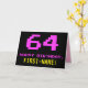 La parte delantera de este divertido, nerd y geeky diseño de tarjetas de felicitación de cumpleaños incluye un gran número de "64" y el mensaje "FELIZ CUMPLEAÑOS", color rosa, junto con un audaz nombre de destinatario editable amarillo. El texto tiene un aspecto inspirado en el de los clásicos gráficos de videojuegos/computadoras de 8 bits de los años 70 y 80, y el fondo es negro de color. El interior tiene un mensaje de saludo de cumpleaños modificable, o tal vez podría ser borrado y dejado en blanco si se va a escribir un mensaje a mano. Una tonta tarjeta de cumpleaños personalizada como esta podría ser una manera divertida de celebrar el 64 cumpleaños de alguien. [~Z0000478]