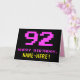 La parte delantera de este divertido, nerd y geeky diseño de tarjetas de felicitación con temática de cumpleaños incluye un gran número rosa "92", junto con el mensaje "FELIZ CUMPLEAÑOS", en rosa, y un audaz nombre de destinatario personalizado amarillo. El texto presenta un aspecto inspirado en los clásicos videojuegos de 8 bits y gráficos de videojuegos de los años 70 y 80, y el fondo es negro de color. El interior tiene un mensaje personalizado de bienvenida de cumpleaños, o tal vez podría ser borrado y dejado en blanco si un mensaje se escribe a mano en su lugar. Una tonta tarjeta personalizada de cumpleaños como esta podría ser una manera divertida de enviar un mensaje celebrando el cumpleaños número noventa de alguien. [~Z0000478]