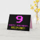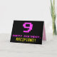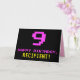 La parte delantera de este divertido, geeky y nerd diseño de tarjetas de felicitación de cumpleaños incluye un gran número rosa "9", junto con el mensaje "FELIZ CUMPLEAÑOS", en rosa, y un audaz nombre de destinatario de personalizable amarillo. El texto tiene un aspecto inspirado en el de los clásicos gráficos de videojuegos/computadoras de 8 bits de los años 70 y 80, y el fondo es negro de color. El interior tiene un mensaje personalizado de bienvenida de cumpleaños, o quizás podría ser borrado y dejado en blanco si un mensaje se escribe a mano en su lugar. Una tonta tarjeta de cumpleaños de personalizable como esta podría ser una manera divertida de reconocer el noveno cumpleaños de alguien. [~Z0000478]