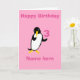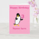 Un lindo pingüino personalizado, tarjeta de cumpleaños para niños, añada el nombre de la edad, cualquier mensaje extra y nombres dentro. Imagen dentro de tres pingüinos jugando. Rosa para una versión chica.
