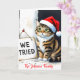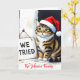 La tarjeta personalizable perfecta para familias que abrazan el caos. Esta divertida tarjeta de felicitación doblada presenta un gato torpe en acuarela que lleva un sombrero de Santa diminuto y un letrero editable que dice "¡Lo intentamos!". Incluye una gran plantilla de foto personalizada en la parte posterior para subir tu propia foto familiar incómoda. Todas las áreas de foto, campos de texto y el mensaje interior son objetos de plantilla totalmente editables. Ideal para aquellos que buscan humor temático de mascotas, tarjetas de fotos divertidas o anuncios de suéter feo que permiten la personalización completa de la broma y las firmas.