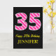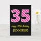 El frente de este divertido y simple diseño de tarjeta de felicitación con tema de cumpleaños presenta un gran número "35", con un patrón de rayas rosa oscuro y rosa claro. También presenta el mensaje "Feliz cumpleaños 35," y un nombre personalizado. El fondo de la parte delantera está coloreado de negro. El interior presenta un mensaje de felicitación de cumpleaños personalizado, o quizás podría estar en blanco si se desea escribir un mensaje a mano en su lugar. Una tarjeta de cumpleaños personalizable como esta podría ser una forma divertida de enviar un mensaje en celebración del cumpleaños número treinta y cinco de alguien. [~Z0000377]